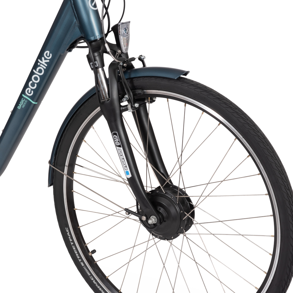 Med en Ecobike Basic får du en solid elcykel til billig penge. Elcyklen er udstyret med forhjulsmotor, som har et virkeligt godt bundtræk, så man hurtigt kommer op i fart. Udover det har den V-bremser på for- og baghjul samt fodbremser på baghjulet. Basic har 3 indvendige gear, affjederet forgaffel og integreret for- og baglys. En virkelig god elcykel til de daglige pendlerture til og fra job, studier, fritidsinteresser eller indkøbsture mv. Og som et ekstra plus har cyklen lav indstigning, så du har nemmere ved at stige på og af cyklen.